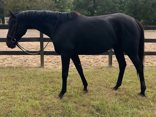 5 year old black OTTB mare stands at 16.1hh. Georgee is a beautiful mare with 3 great gaits. She was just restarted from being off the track and doing very well. She picks up things very quickly! She has done some crossrails and didn’t think twice about going over them.